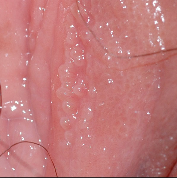 • Nổi đầy các nốt sùi đỏ đổi màu hoặc màu xám hồng tại cơ quan sinh dục.